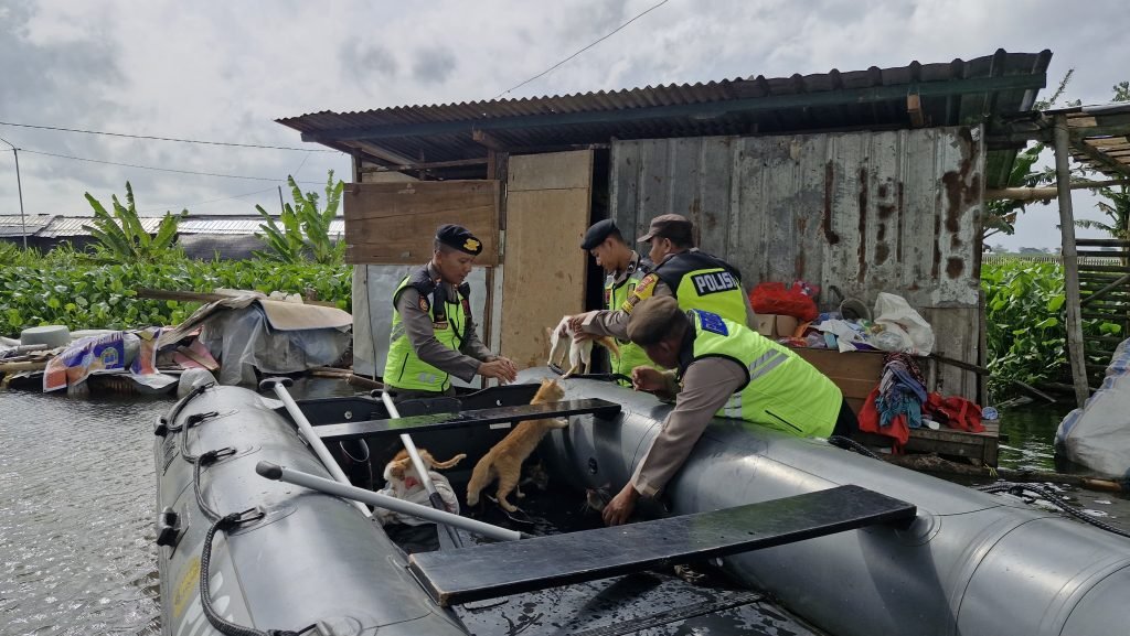 Kasat Samapta AKP Noor Alifi bersama sejumlah personel melakukan evakuasi menggunakan perahu. Tujuh ekor kucing milik Mbah Narti dalam kondisi selamat. Kabar tersebut disampaikan kepada Mbah Narti di posko pengungsian.